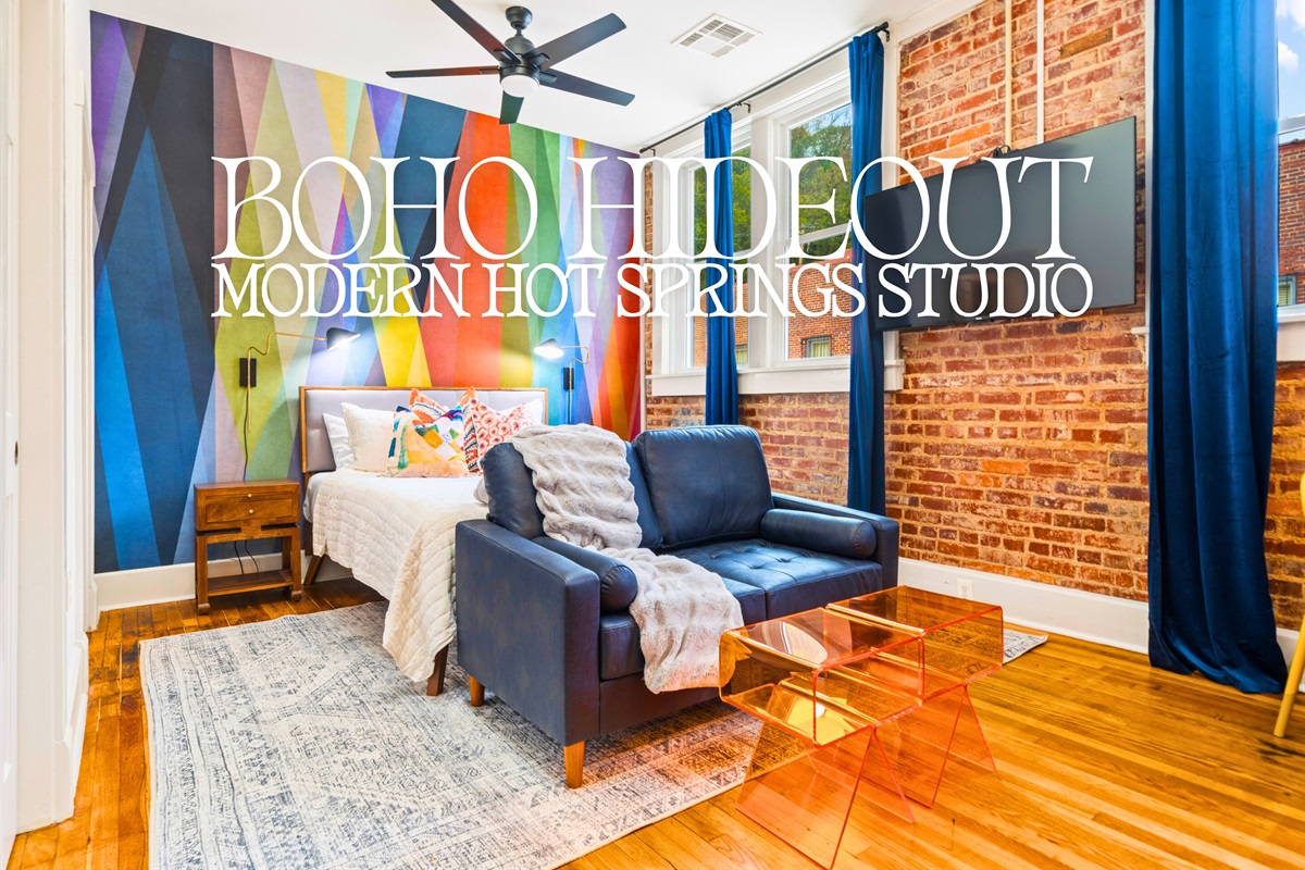 Boho Hideout is located on Central Avenue, steps from historic Bathhouse Row. Explore the local shops, restaurants, and galleries, or soak in the charm of Hot Springs. With its unbeatable location and lively interior, this studio is your perfect home base for discovering everything downtown has to offer.