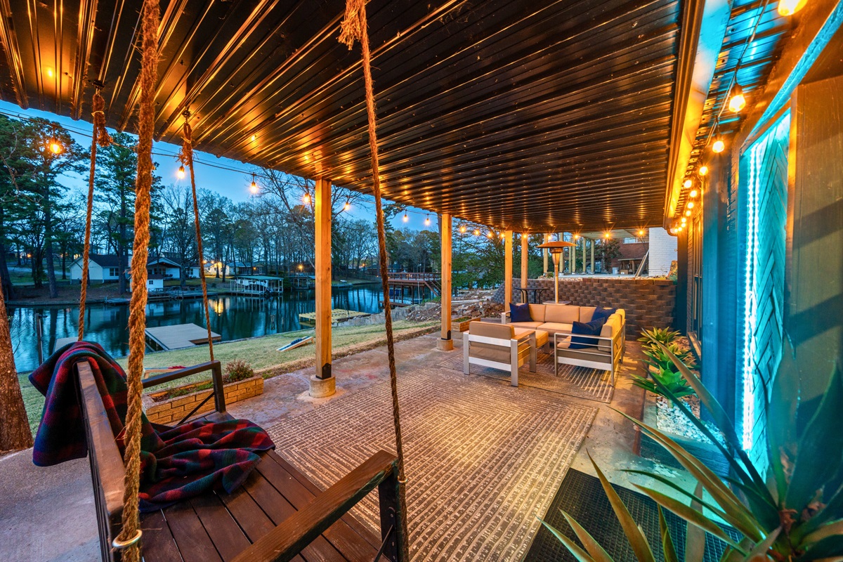 - Spacious deck with cozy seating, ambient string lights, and outdoor dining